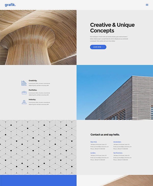 Choose from ten awesome home pages and use the power of Grafik to make them your own. Easily change all colors, rearrange sections, add new elements, and so much more.